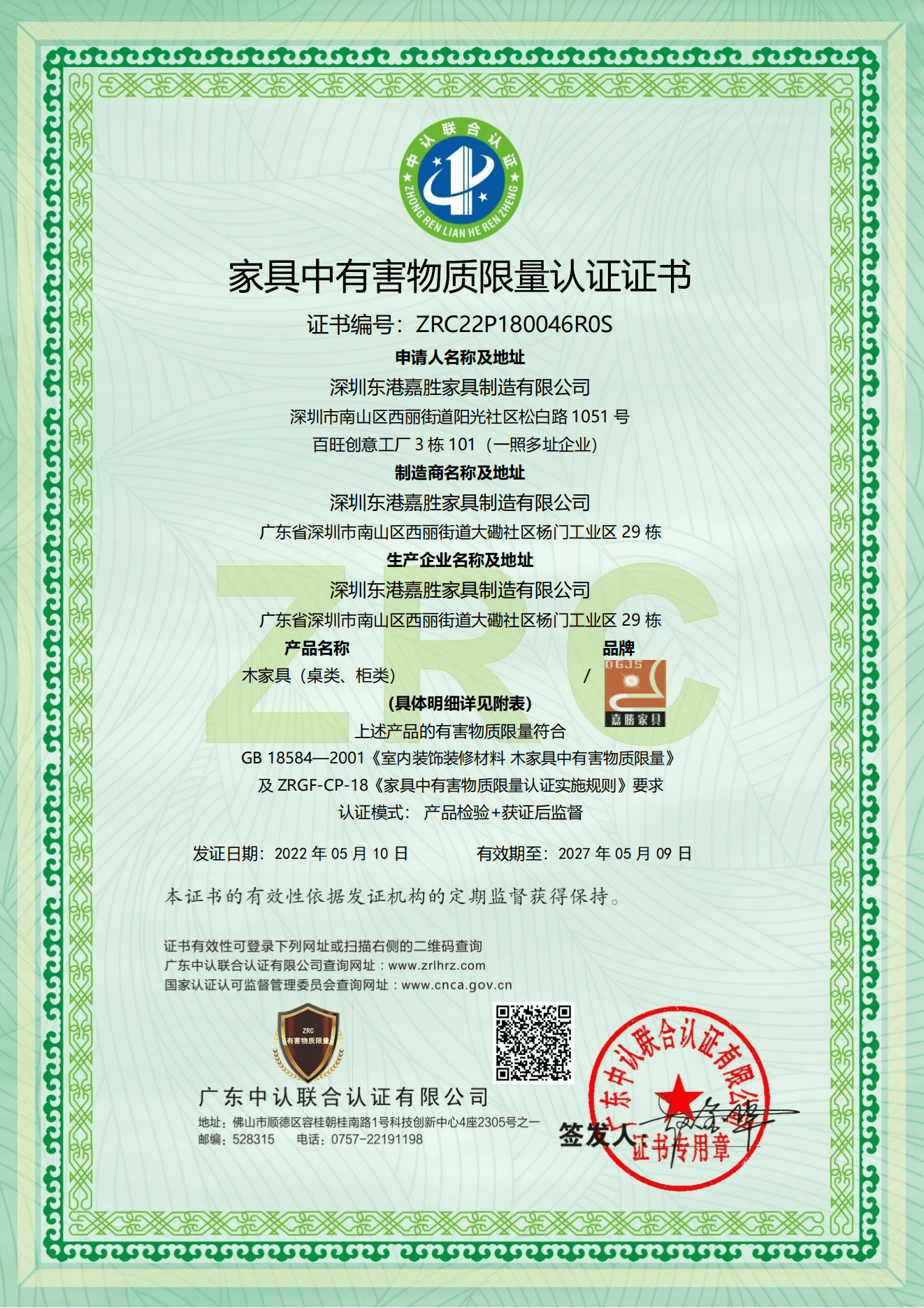 家具中有害物質(zhì)限量認(rèn)證證書(木家具)