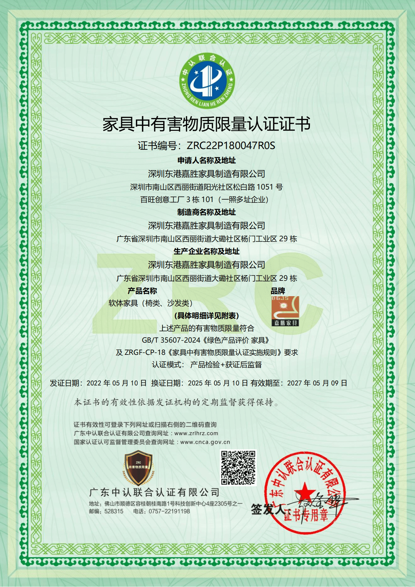 家具中有害物質(zhì)限量認(rèn)證證書(軟體家具)